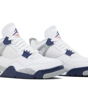 The Air Jordan 4 Retro White Midnight Navy dresses in white, midnight navy, and light smoke grey colorway.